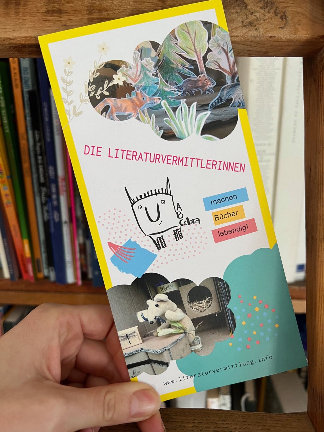 Als zertifizierte Literaturvermittlerinnen wenden wir unser Wissen auf ganz unterschiedliche, individuelle Weise an: Manche von uns bauen Bühnen, manche haben einen musikalischen Schwerpunkt, manche schaffen Leseerlebnisse in der Natur, weil sie vielleicht auch noch zusätzlich eine Ausbildung zur Waldpädagogin haben. Da ich Kunstpäadagogin und Atelierista bin ist mein Schwerpunkt das Zusammenspiel von